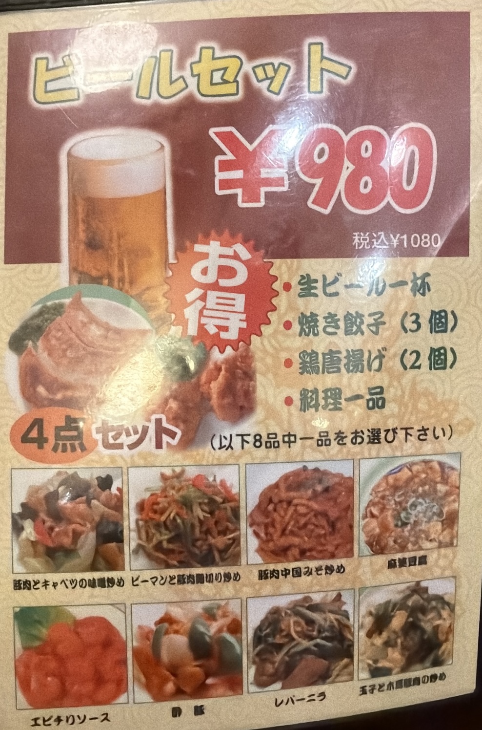 ビールセットも980円(税別)。近所の「美味軒」のおつかれさんセットはかなり値上がりした。メニューも豊富で使える店だ。