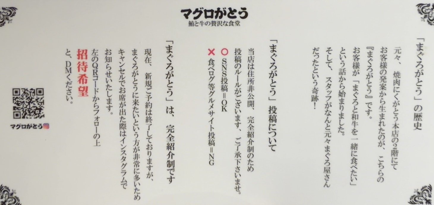 「まぐろがとう」は、にくがとうでおなじみの「がとうグループ」による住所非公開・完全会員制のブランド。「がとうグループ」の中でも予約が困難な店。