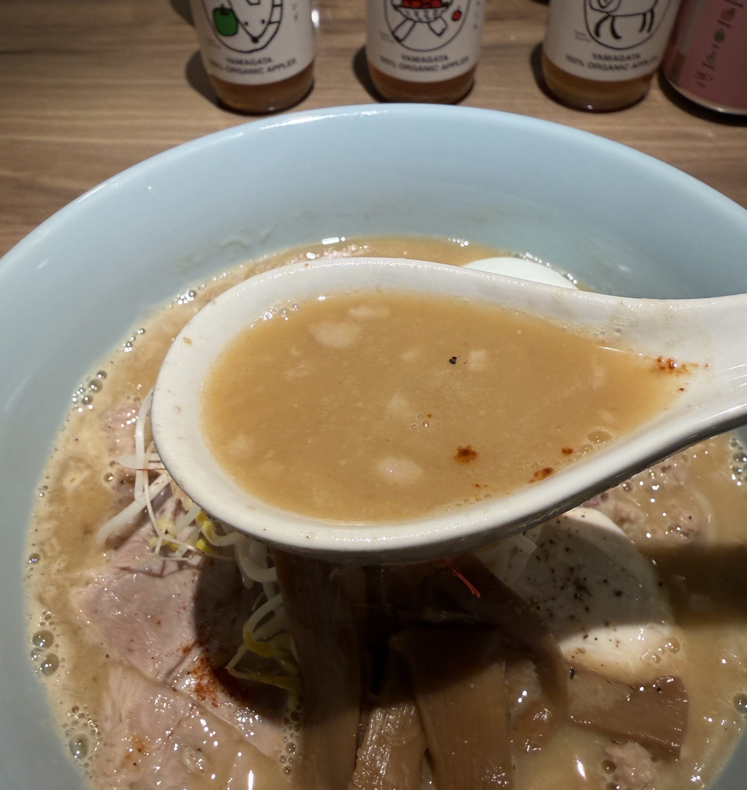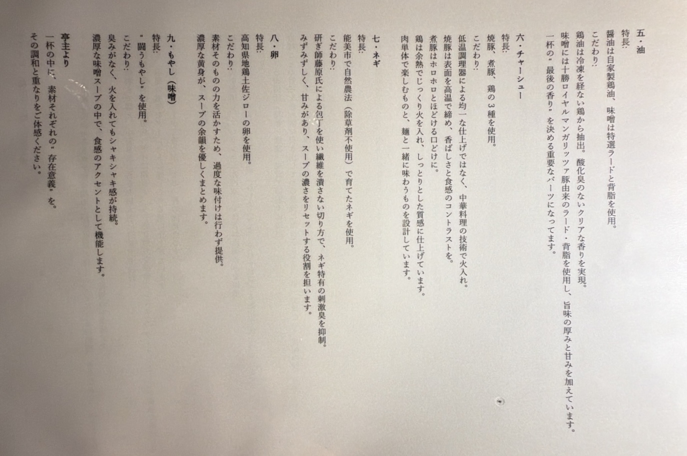 チャーシューなどの具材の調理法もほぼ確立された感があり、お味的にもビジュアル的に新しいものはなかった。それぞれは美味しいんだろうけど。