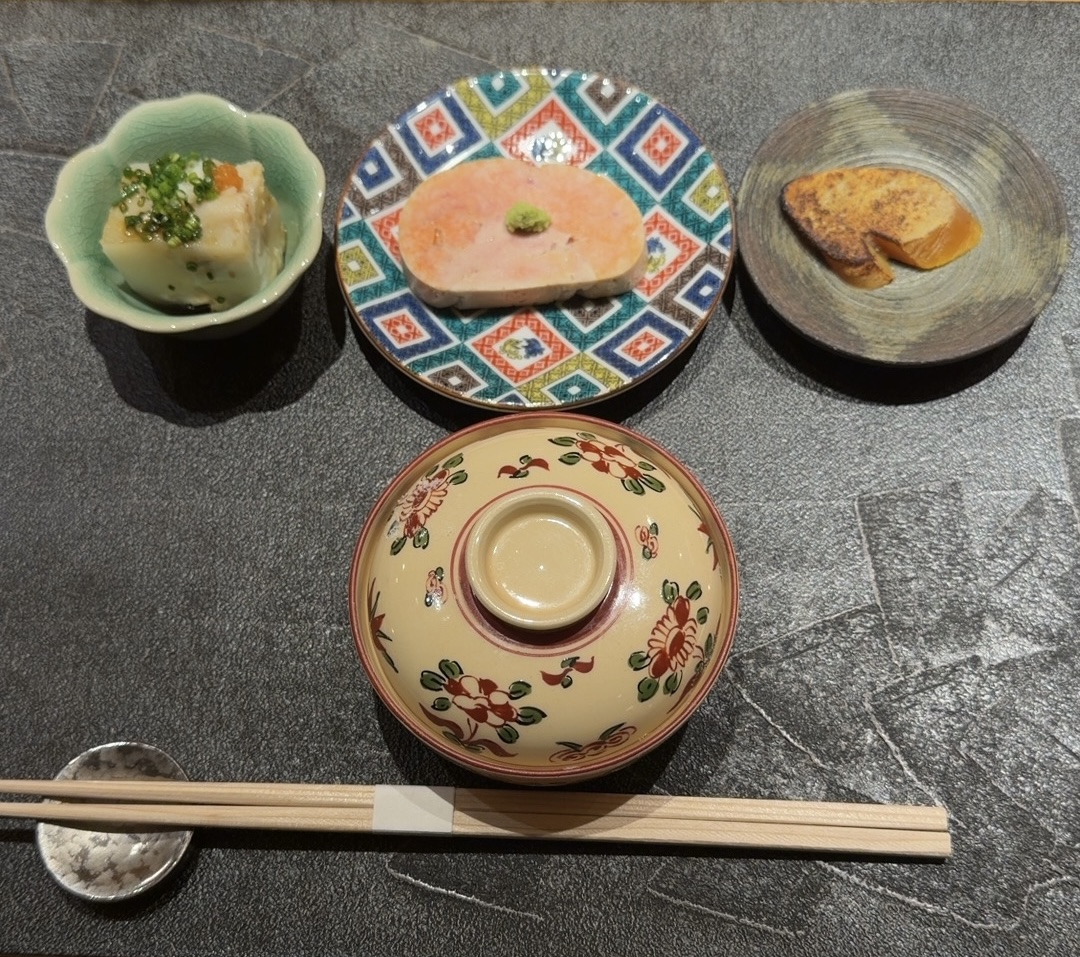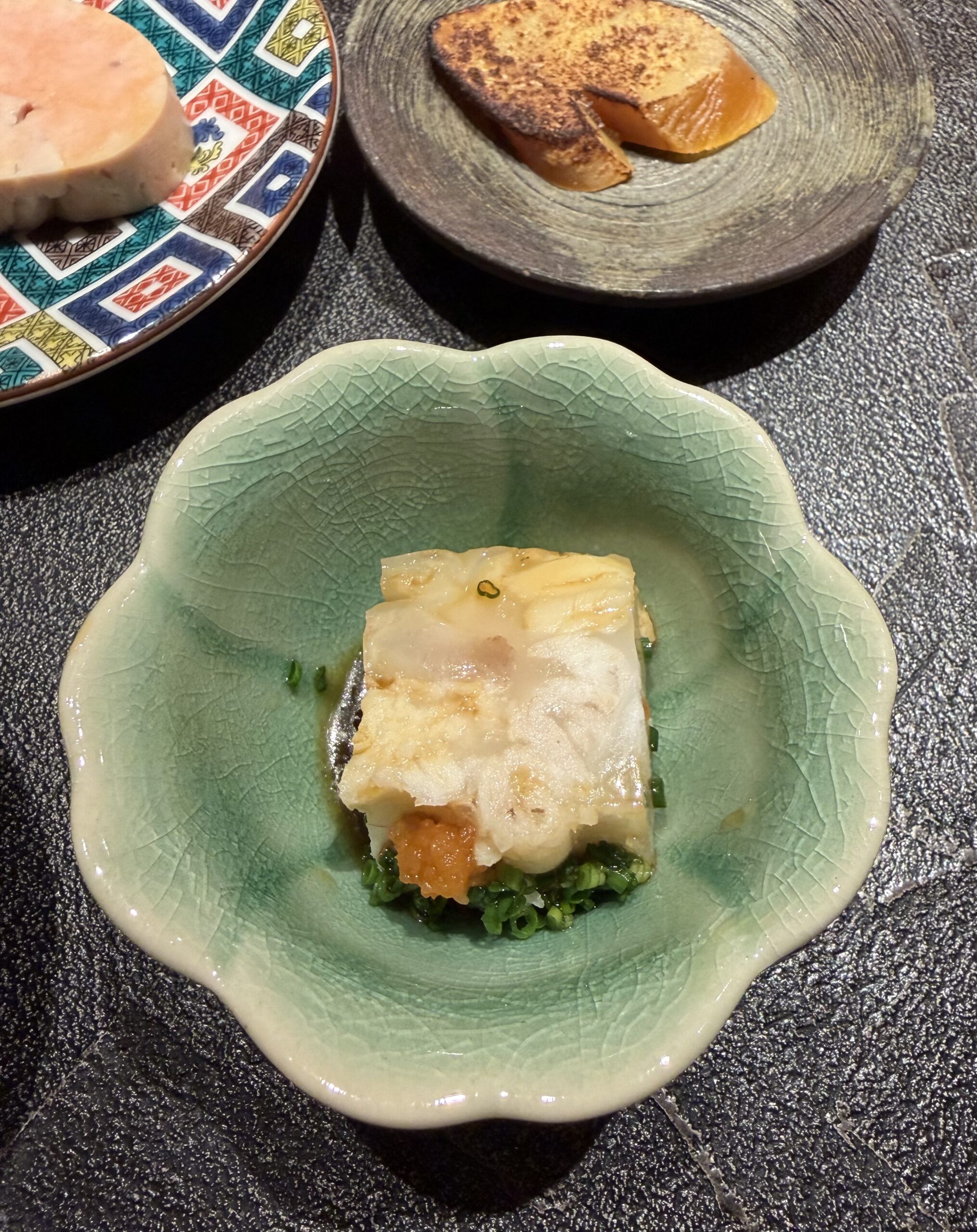 クエの煮凝り あん肝 からすみの炙り 白子豆腐