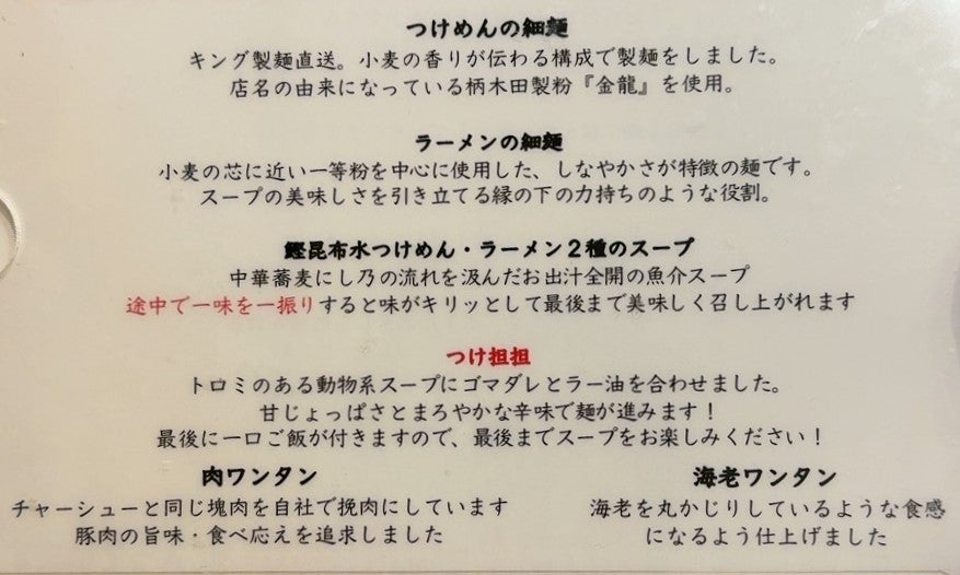 yahoo travel 【つけ麺】「つけめん金龍」昆布水つけ麺:小川町 つけ麺 2024.03.05 食べログ3.83 ラーメン TOKYO 百名店 2023 選出店 らぁめん小池系列店 夕方開店20分前到着 一番乗り 最近はやりの昆布水つけ麺 1000円にしてみる 藻塩 あっさり系のつけ麺だった。 つけめん金龍 東京都千代田区神田司町2丁目15−1